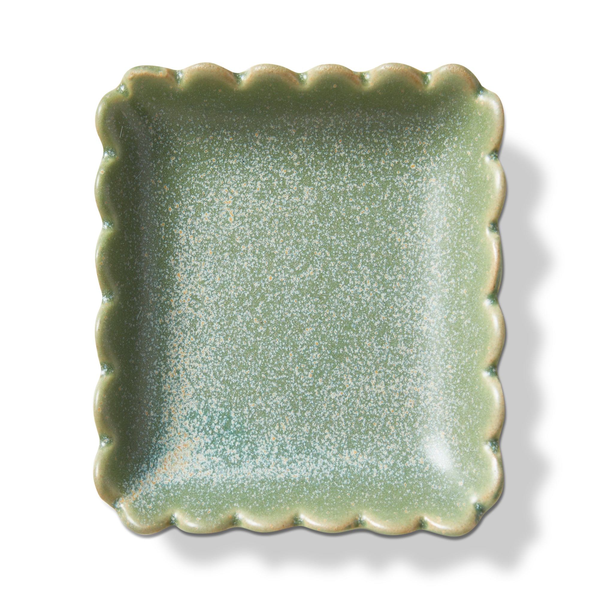 Scallop Square Trinket Dish is a stoneware catchall with gentle scalloped edges and a light green reactive glaze. Use for rings, tea bags, salt pinch, or paper clips.