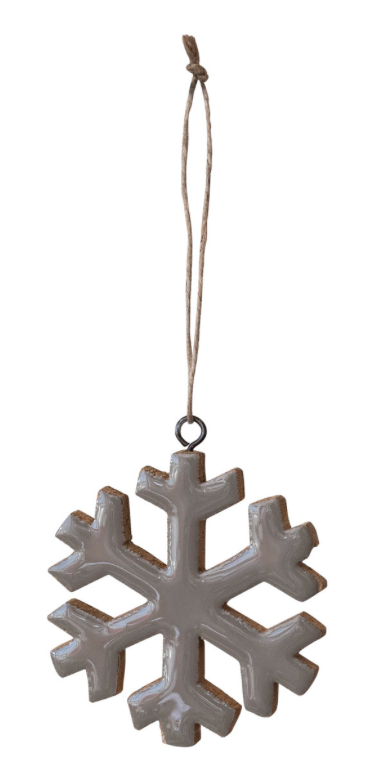 Elevate your holiday decor with this gray enameled snowflake made of mango wood.