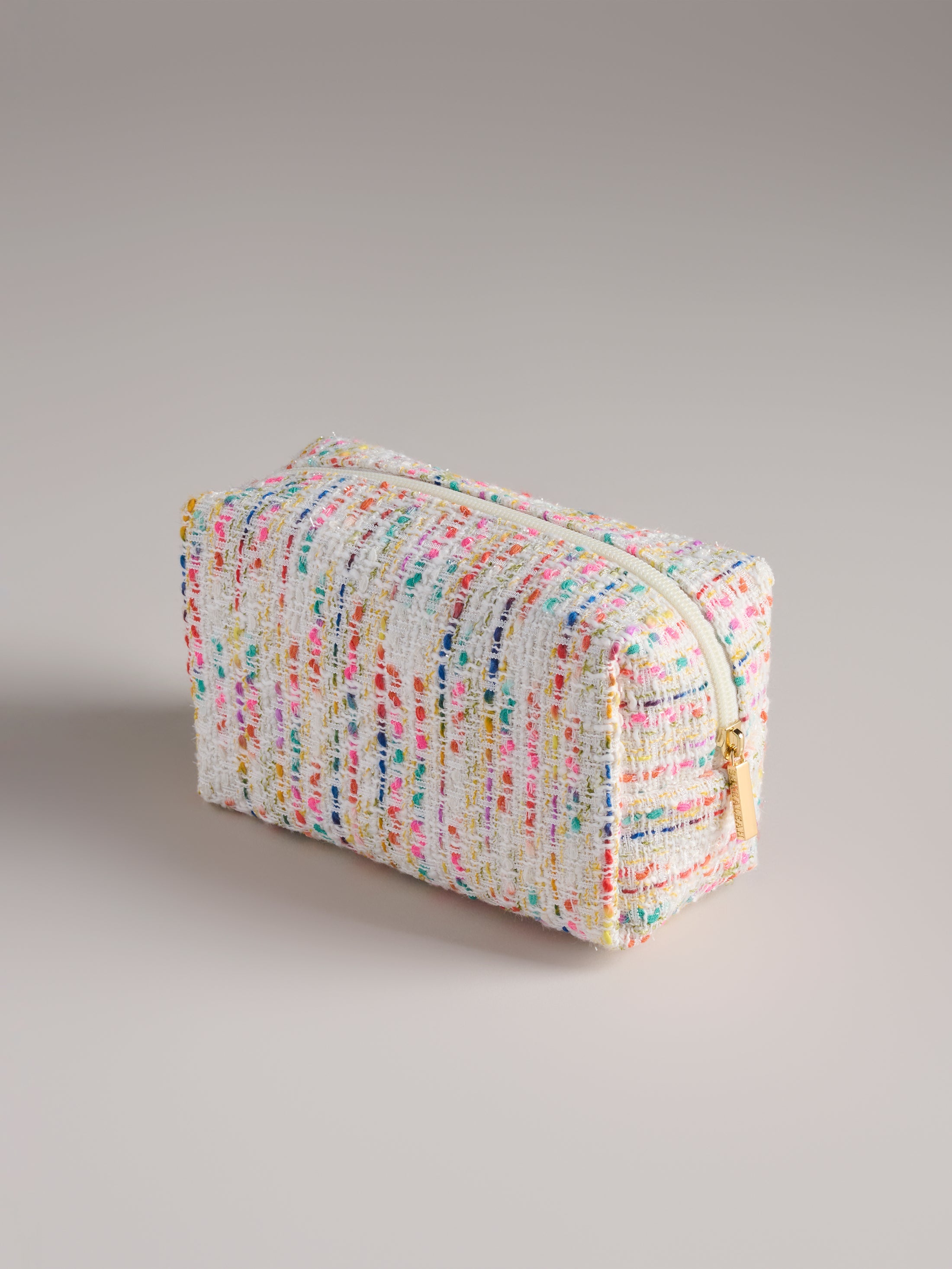 Crafted with a colorful, textured boucle fabric, this petite pouch adds a playful pop to your everyday routine. Its boxy silhouette and secure top-zip closure keep your beauty essentials or tiny treasures safely tucked inside. Whether it's tossed in your tote or perched on your vanity, this pouch makes organizing feel like a treat.
