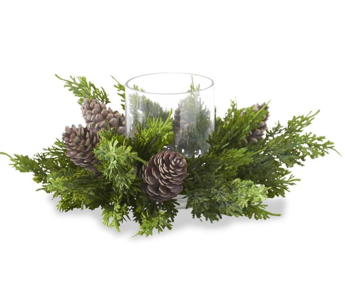Cypress Pine Candle Ring with Hurricane and Pinecones - 2 sizes