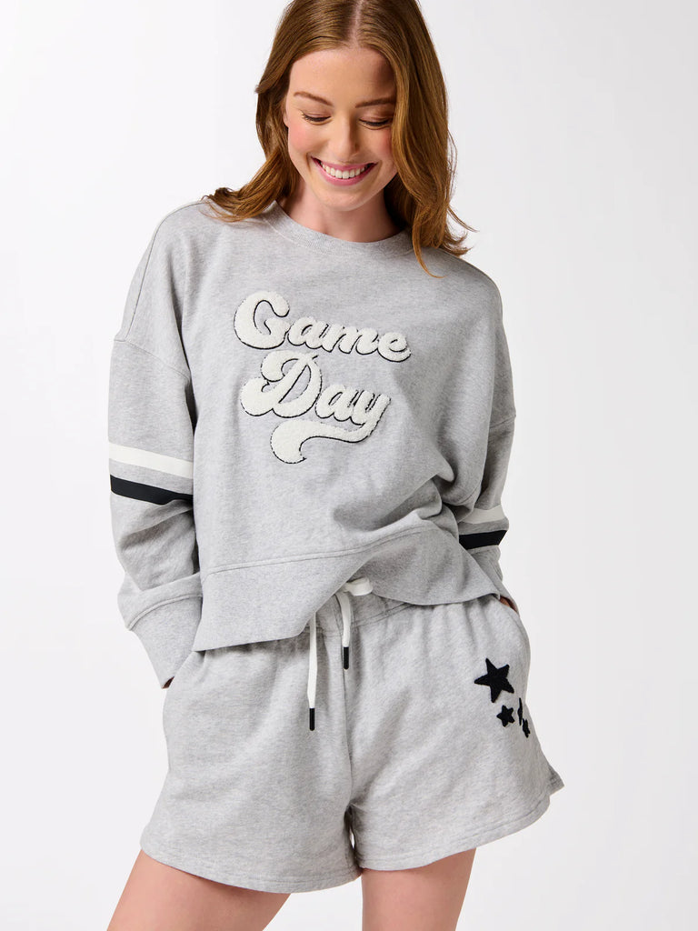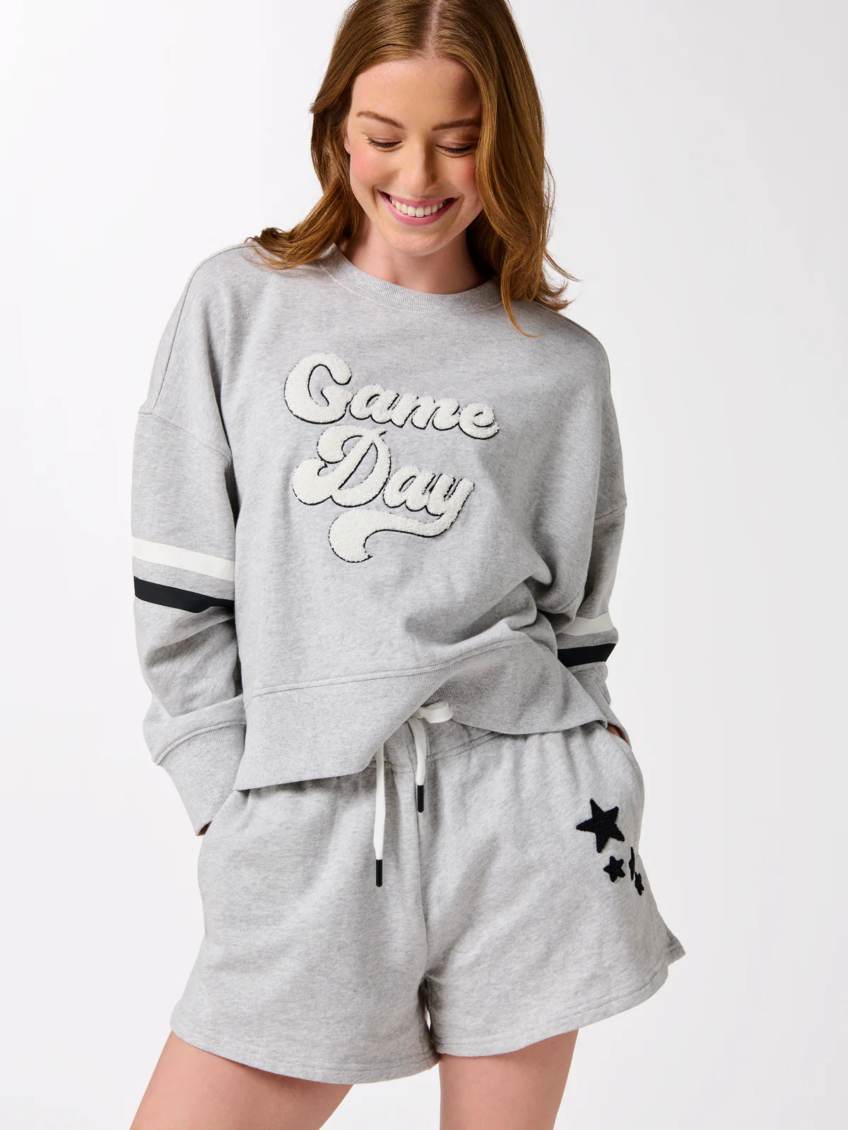 Show your team spirit in cozy style with the “Game Day” Relaxed Sweatshirt, a fan-favorite from Shiraleah's Gameday Collection. This heather grey pullover features sporty sleeve stripes and bold embroidered "Game Day" lettering across the chest for that classic varsity vibe. Its relaxed fit and soft cotton fabric make it a go-to whether you're home on the couch or bundled up in the bleachers. Pair it with joggers, jeans, or our matching shorts for an effortlessly cute game day look.