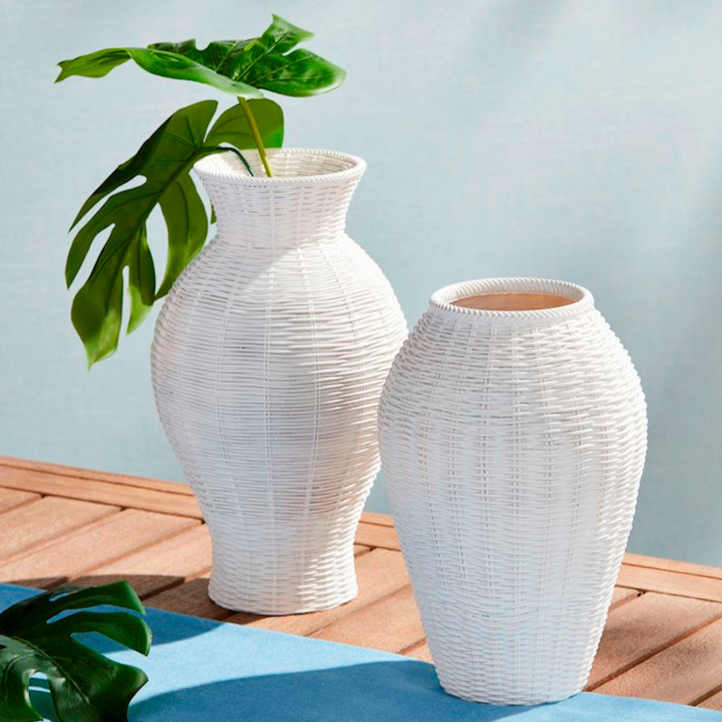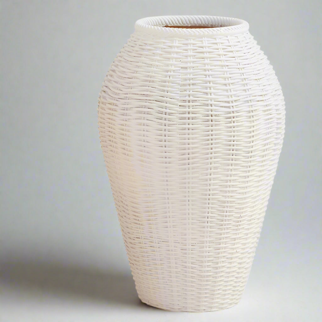 Add an elegant touch to any room with our White Resin Basket Weave Vases. Crafted from watertight resin, these vases feature a unique basket weave texture and are available in two sizes to fit any display.