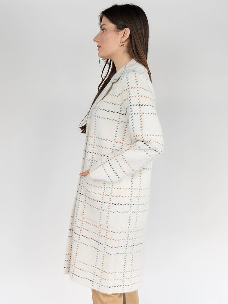 This elegant winter white long coat features a subtle plaid pattern and is crafted from a blend of 85% nylon and 15% polyester for both style and comfort.
