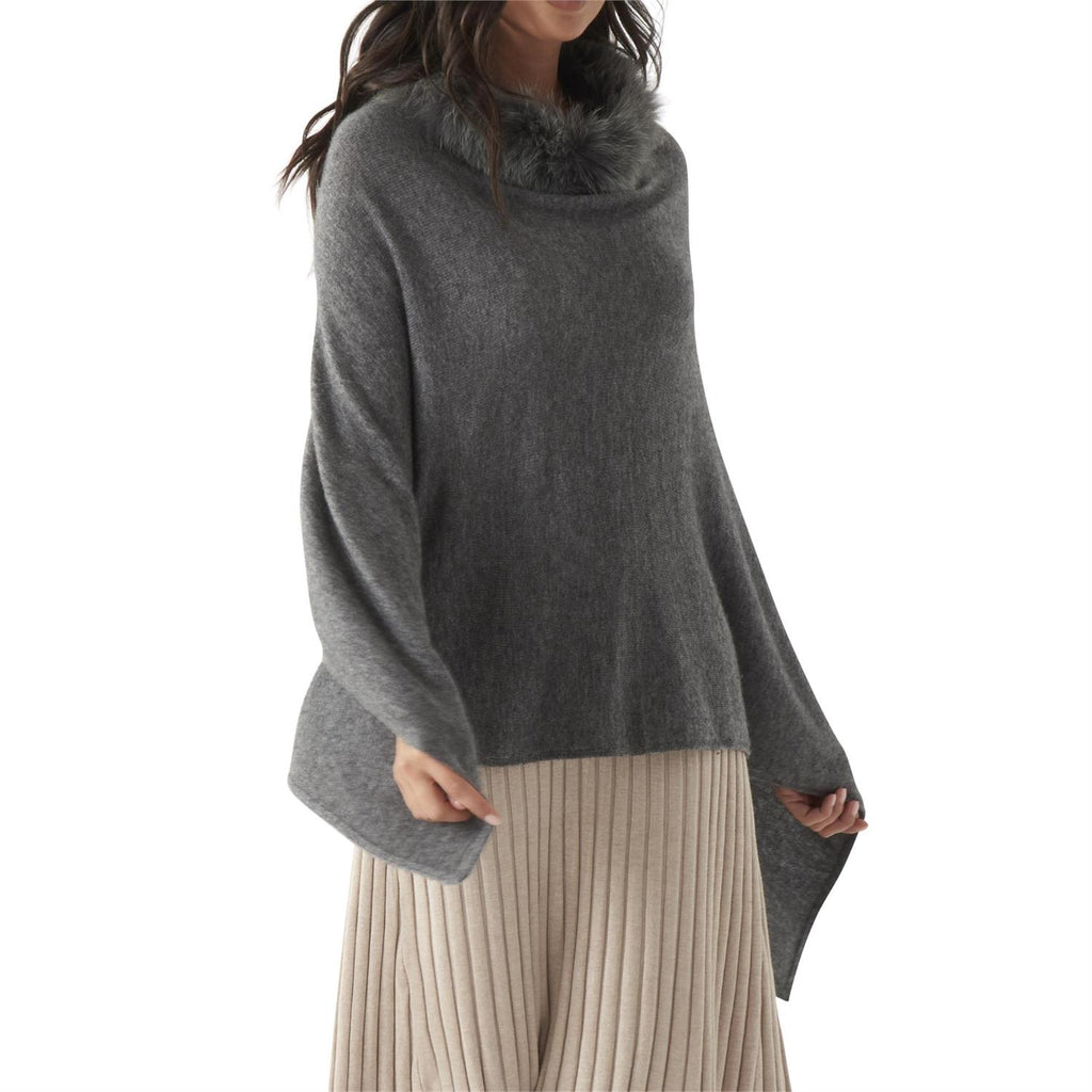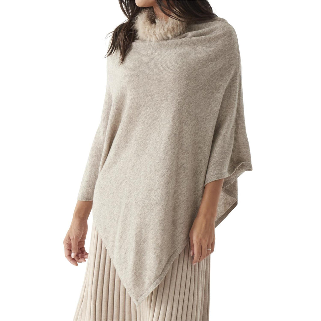 This elegant poncho features a fur collar and is available in a refined gray or classic tan.