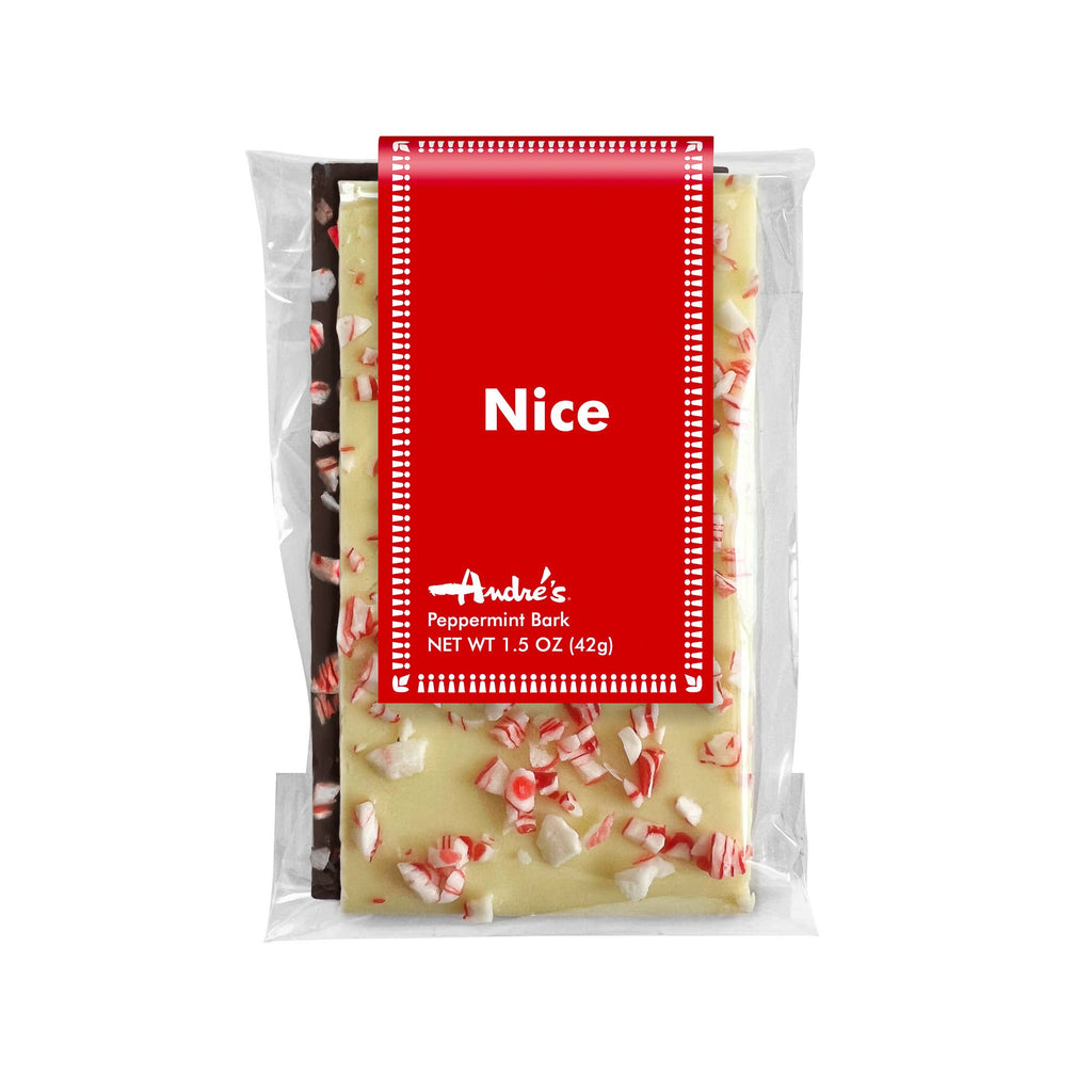 Delicious solid white and dark chocolate bars dusted with crushed peppermint candy. Choose from Naughty or Nice !