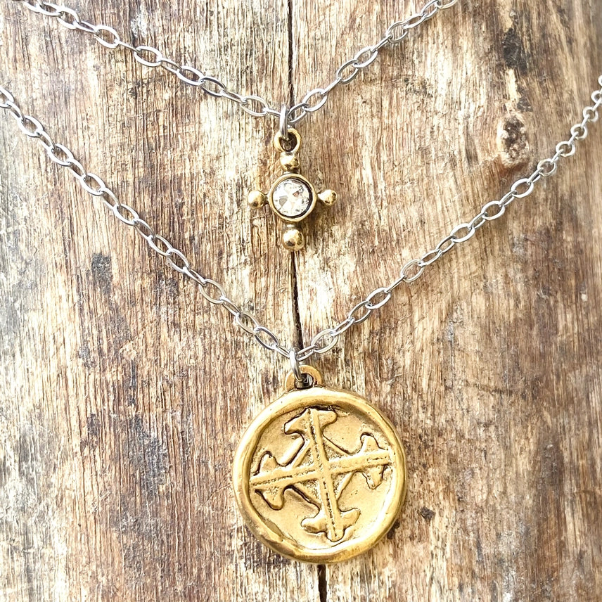 This necklace is 2 layers (one piece) and reversible! The first layer is a hand casted mini vintage cross with a sparkly Swarovski crystal. The second layer is a hand casted vintage cross and if you turn it over you will see the serenity prayer. This makes a very special gift. Stainless steel non tarnishing chain. Adjustable up to 20”