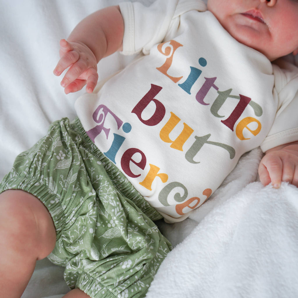 We found THE PERFECT onesie for your special "Little but Fierce" girl! Made with 100% luxury cotton, these baby onesies are soft, stretchy, and breathable to accommodate for the comfort of growing babies. The unique design features fold over shoulders, snap bottom, printed neck label for baby's comfort.