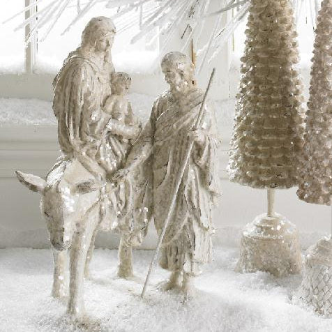 This glittered nativity piece captures Joseph, Mary and baby Jesus journeying together - bringing craftsmanship and reverence and to this timeless biblical scene.