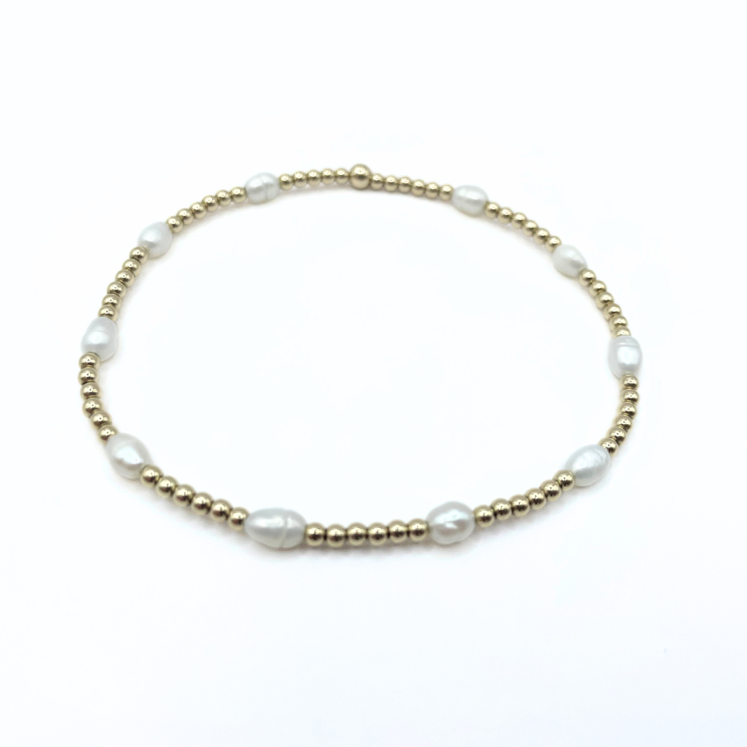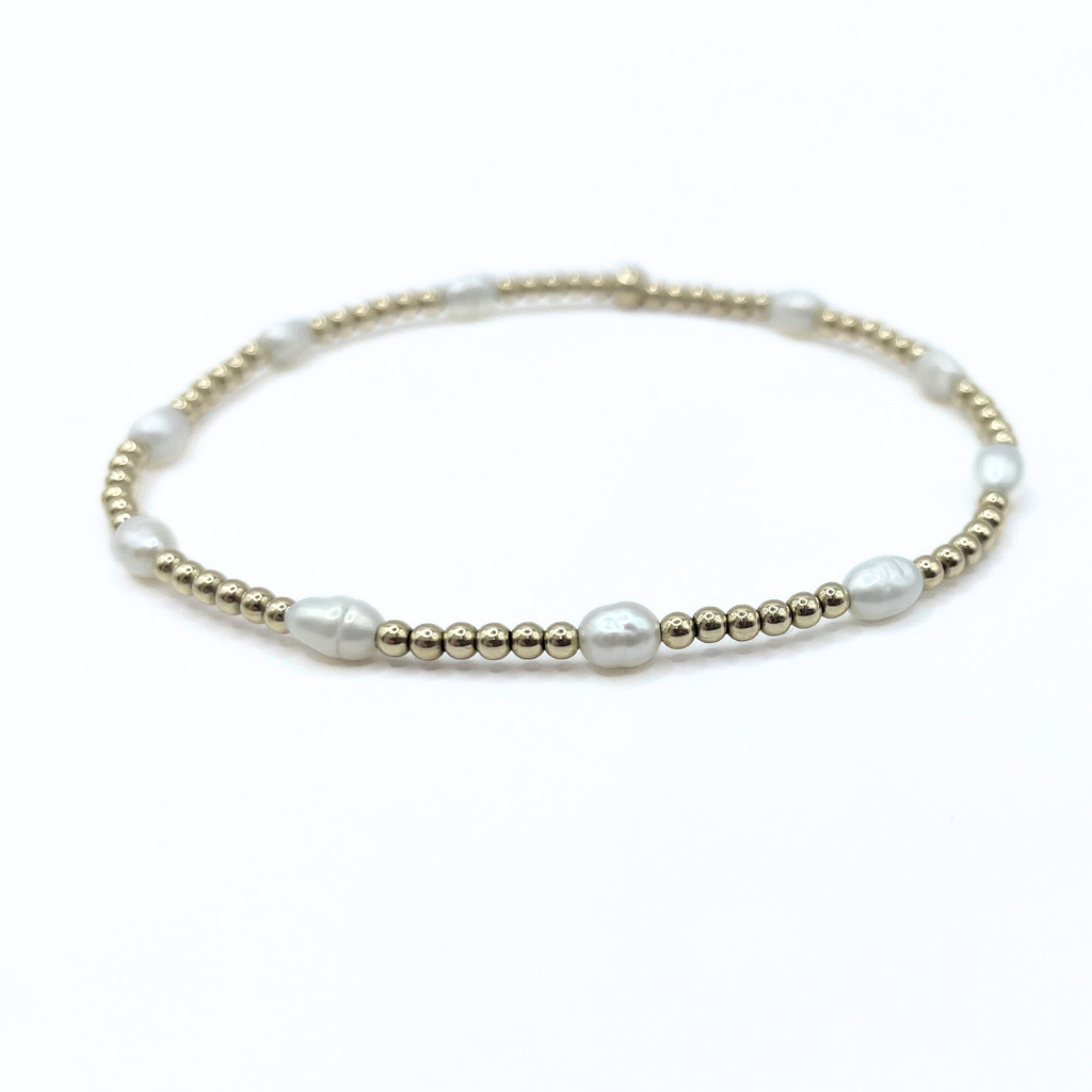Take a look at this stretch bracelet with 14k gold filled and waterproof beads with dainty, natural rice pearls. Each pearl is slightly different in shape, which makes this sweet bracelet even more special. Wear single or stack it - part of our erin gray waterproof collection.